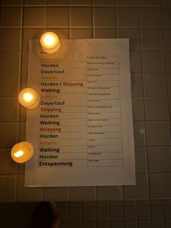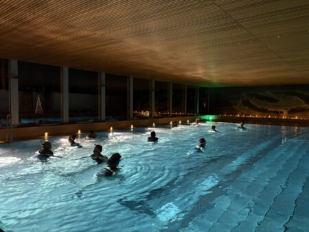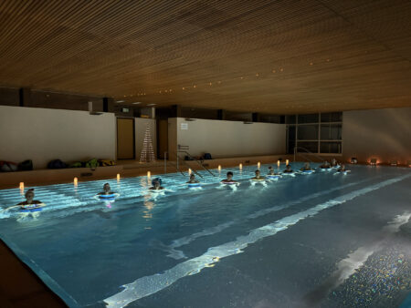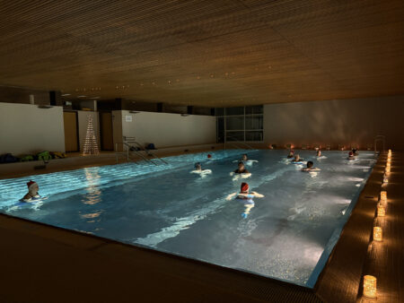 Umrahmt mit viel Kerzenschein laufen die Aqua-Fitterinnen zu mehr oder wenigen gemütlichen, stimmigen, lauten, leisen, berührenden, mitreissenden, hohen und tiefen Tönen durchs Wasser und geniessen Ihre Auszeit. Der Offschalter ist gedrückt und die Gedanken kommen zu Ruhe.