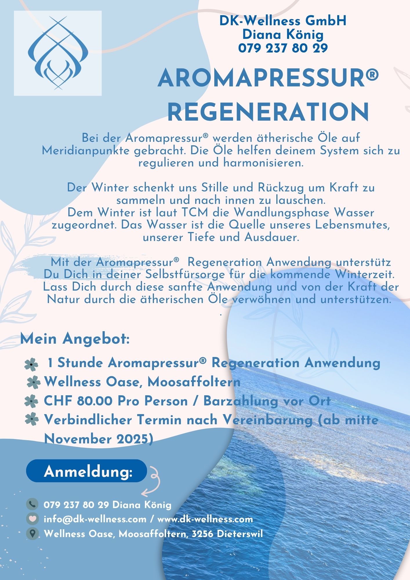 Ab Mitte November 2025 biete ich die Aromapressur® Regeneration Anwendung in der Wellness Oase in Moosaffoltern an.