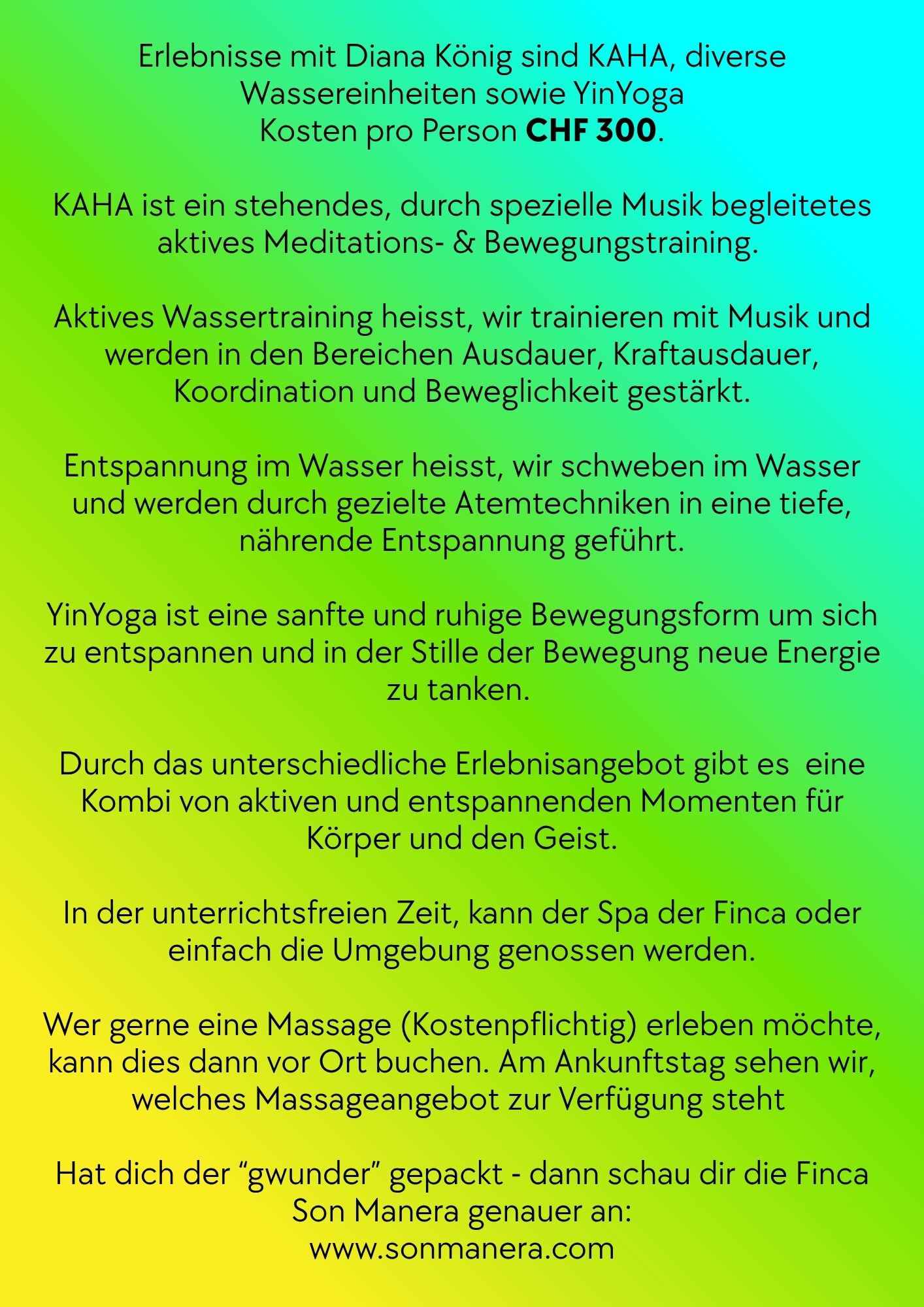 Das Angebot von mir wird in dieser Woche KAHA, aktive Wassertrainings, Entspannung im warmen Wasser und YinYoga sein!