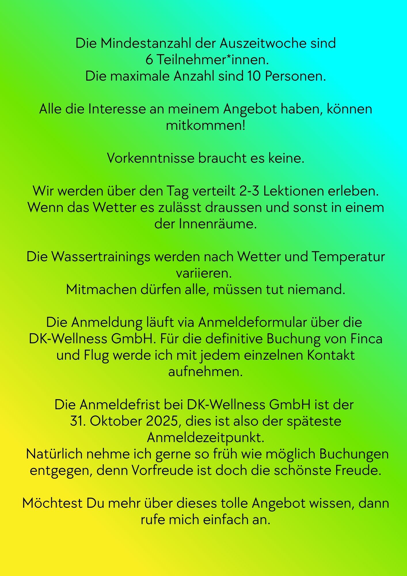Wenn Du Interesse an dieser Auszeitwoche hast, noch mehr Infos brauchst oder buchen möchtest, dann nimm bitte mit mir Kontakt auf!